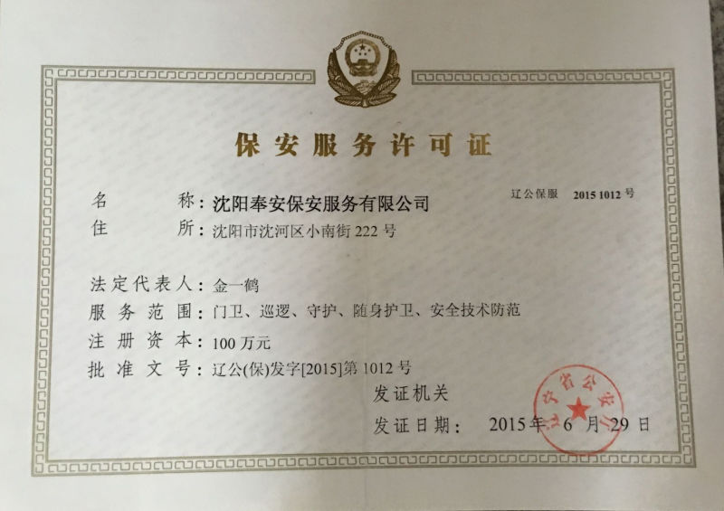 沈陽(yáng)奉安保安服務(wù)有限公司(原沈陽(yáng)市沈河區(qū)保安服務(wù)公司)創(chuàng)建于一九八八年八月,是遼寧省公安廳、沈陽(yáng)市公安局批準(zhǔn),工商行政部門登記注冊(cè),全市首家具備保安資質(zhì)的特殊性服務(wù)企業(yè),隸屬于沈陽(yáng)市沈河區(qū)政府直管的全民國(guó)有企業(yè),現(xiàn)為中國(guó)保安協(xié)會(huì)會(huì)員單位和省保協(xié)、市保協(xié)常務(wù)理事單位:在全市同行業(yè)中率先通過(guò)ISO國(guó)際質(zhì)量認(rèn)證,是市工商局批準(zhǔn)的“重合同守信用”免檢單位和沈陽(yáng)市政府采購(gòu)中心保安服務(wù)項(xiàng)目重點(diǎn)競(jìng)標(biāo)單位;擁有一支專業(yè)化、標(biāo)準(zhǔn)化、職業(yè)化的高素質(zhì)保安隊(duì)伍,是公安機(jī)關(guān)重要的輔警力量。查看更多 >> -